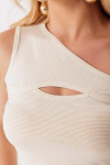 Em tons neutros, é perfeito para combinações versáteis, permitindo que você crie looks incríveis para qualquer ocasião. O recorte moderno no busto adiciona um detalhe estiloso, realçando sua silhueta de maneira sofisticada.